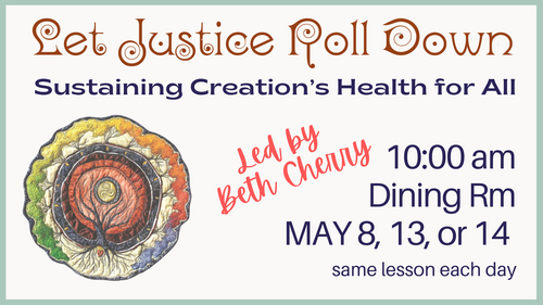 May's Let Justice Roll Down Bible study will be led by Beth Cherry. The theme is Sustaining Creation's Health for All. Scripture and modern science help us see nature’s wisdom more clearly and lead us to seek just ways to care for the earth and one another. We will explore scripture from Genesis 1:29-30; Psalm 104; Isaiah 2:1-5; Micah 4:1-4; Matthew 13:31-32.