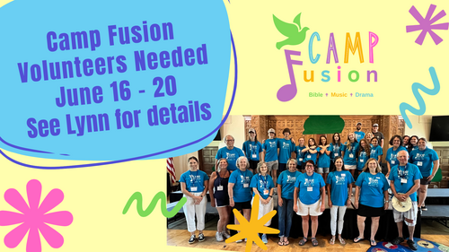 Camp Fusion is rapidly approaching and we are in need of several additional volunteers to help as shepherds with children, and to assist in lunch preparation. Please contact Lynn Warner for additional information! We guarantee you will have a great time!