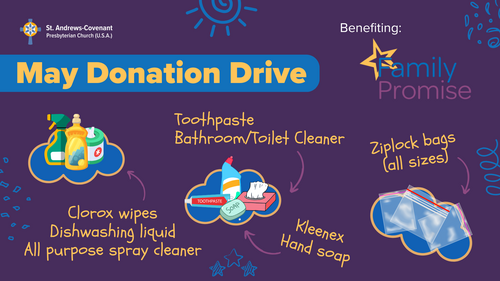 We are collecting various items in May for Family Promise, a ministry we have supported for many years. Locally, Family Promise "supports families experiencing housing instability, including domestic violence survivors, to achieve sustainable independence." With the help of local churches, they provide temporary housing, meals, and fellowship. SACPC provides dinners and mealtime fellowship four weeks a year. It's always a privilege to share that time with these families.