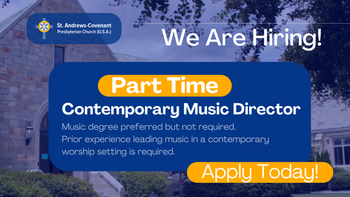 St. Andrews-Covenant Presbyterian Church is looking to hire a Contemporary Music Director to join our team. This position offers the unique opportunity to lead an already established group of dedicated volunteers and skilled paid musicians who share a common goal of enhancing our worship experience through music. If you're passionate about music and ministry, we'd love to hear from you!