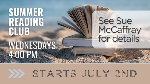 Love to read books that make you think about your faith journey? We're starting a Summer Reading Club! Mark your calendars for Wednesday afternoons at 4:00 pm starting July 2nd. This will be a five week book study--stay tuned for details about the book. More information to follow! Questions? Ask Sue McCaffray.