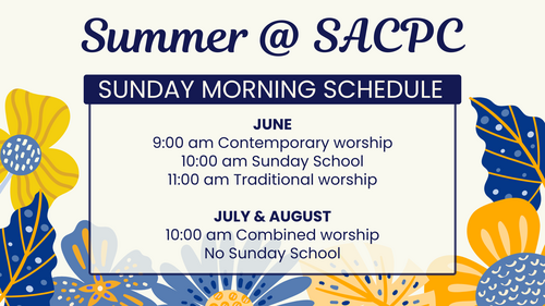 For the months of July and August we will have one combined service at 10:00 am in the Sanctuary. This will be a wonderful time for us all to worship together and help our staff prepare for important changes coming in the Fall.