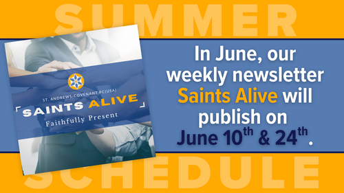 For the month of June, we will publish Saints Alive on a biweekly schedule. This means a new edition of Saints Alive will be delivered to your inbox on June 10th and June 24th. Please be mindful of the altered publishing schedule and ensure your news is submitted with enough advanced notice to reach the congregation. As always, click the button below to submit your news items for publishing.