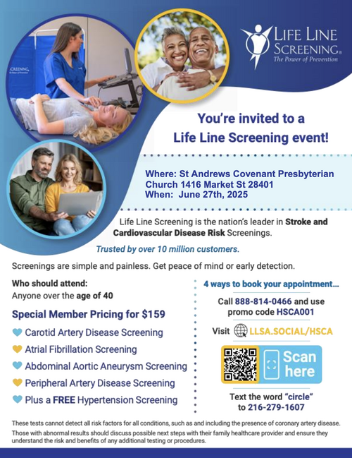 Life Line Screening will be here at SACPC on Friday, June 27th offering safe, painless, non-invasive preventive health screenings that are typically not a part of a routine physical. To be more proactive about your health for yourself, your family and your community, please register for these health screenings today.