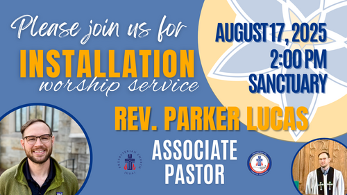 Join us on Sunday, August 17th at 2:00 p.m. to celebrate the installation of Associate Pastor Rev. Parker Lucas. There will be a brief reception following the service in the chapel.