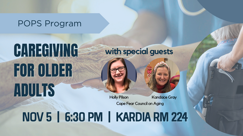 Join us for a VERY informative evening of news you can use: how to navigate caregiving needs that may arise for ourselves or our loved ones through the aging process. Our very own Holly Pilson of the Cape Fear Council on Aging will be with us at POPS on Wed., Nov. 5 in the Kardia Room, 224.