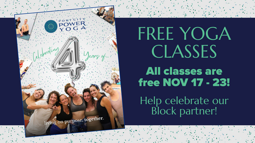 Our gift to YOU as Port City Power Yoga celebrates 4 years! A FREE Week of Yoga November 17-23. All classes are free. Expect raffles, fun & connection. It's been a great 4 years on "the block" and we look forward to many more. Come take a class with us and see what we're all about. No experience necessary.