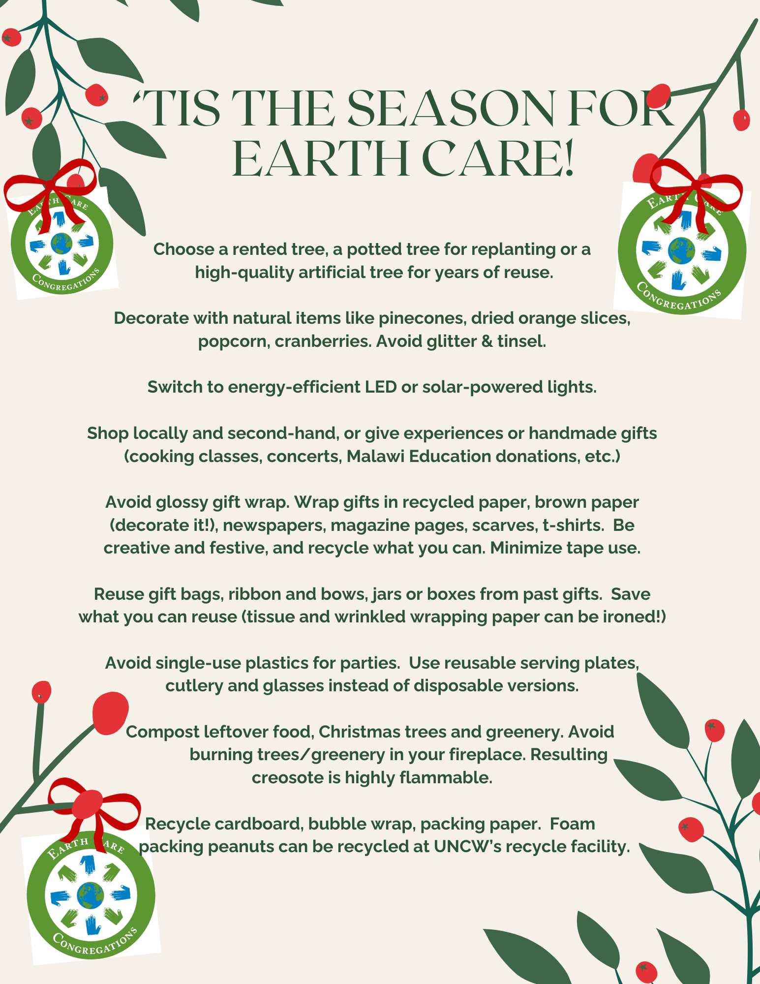 How to wrap all those Christmas gifts and care for our planet? Members of the Earth Care Team will be on hand at the Advent Pancake Supper and Craft Night on Sunday to show you how. Who needs glossy, plastic-coated and expensive commercial gift wrap when you can be creative and unique? Wrap gifts in decorated craft paper, scarves, newspaper and magazine pages, fabric remnants--all things that can be recycled or reused. Visit our table and let our Earth Care elves demonstrate how to turn those mountains of wrapping rubbish into something more Earth-friendly. We hope to see you there!