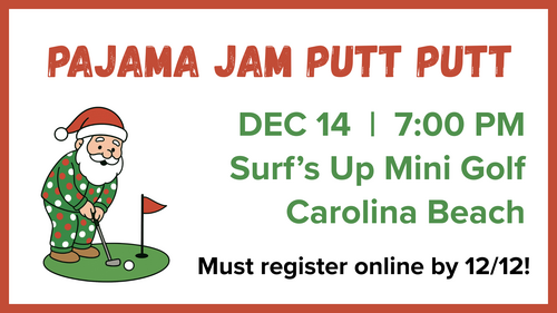 We are taking our annual Christmas party - The Pajama Jam - on the road for a night of Putt Putt in Carolina Beach. Open to all middle and high school students. Friends are welcome, but ALL must register online by Friday 12/12.