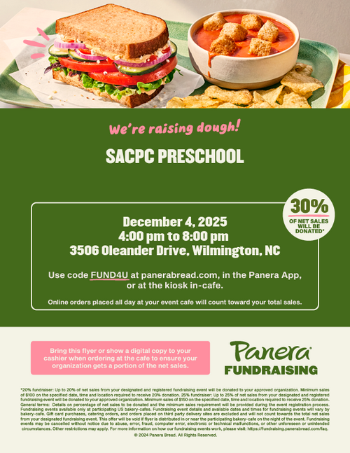 Mark your calendars for Thursday, December 4, and join us for a delicious way to support our preschool! From 4:00 - 8:00 PM, Panera on 3506 Oleander Dr will generously donate 30% of net sales to our preschool when you dine in person. You only need to show them a copy of this flyer or order at the kiosk and use the code FUND4U before paying.