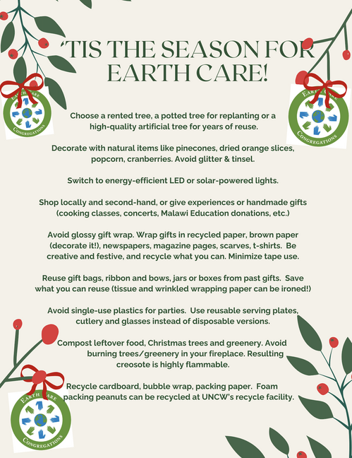 How to wrap all those Christmas gifts and care for our planet? Members of the Earth Care Team will be on hand at the Advent Pancake Supper and Craft Night on Sunday to show you how. Who needs glossy, plastic-coated and expensive commercial gift wrap when you can be creative and unique? Wrap gifts in decorated craft paper, scarves, newspaper and magazine pages, fabric remnants--all things that can be recycled or reused. Visit our table and let our Earth Care elves demonstrate how to turn those mountains of wrapping rubbish into something more Earth-friendly. We hope to see you there!