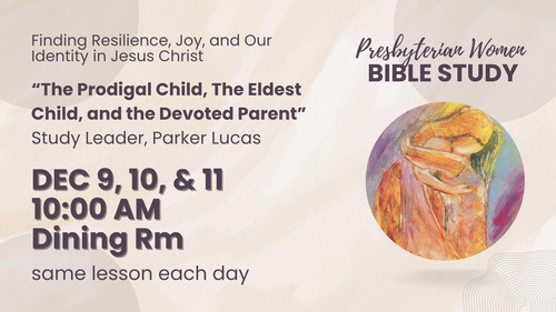 December’s Presbyterian Women’s Bible study will be led by Rev. Parker Lucas. The theme is "The Prodigal Child, The Eldest Child, and the Devoted Parent." God offers grace and love, not because of what we do, but because of who we are—beloved children of God. Main scripture passage is from Luke 15:11 – 32, plus other references in Luke.