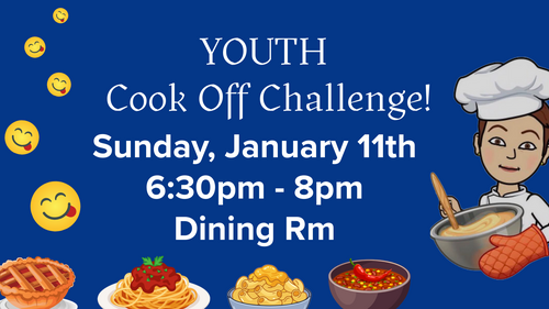 Bring out your best recipe and prepare to compete for fabulous prizes and lots of recognition. We will gather for taste testing and judging, fellowship and fun. Open to all middle and high school students. Friends welcome!