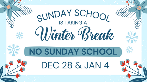 NO CHILDREN, YOUTH OR ADULT SUNDAY SCHOOL ON DEC 28 OR JAN 4. Note: Venture class does NOT meet DEC 14 and Walking in the Word WILL meet at 9:00 am on JAN 4. Our regular Sunday School schedule returns JAN 11 at 10:00 am.