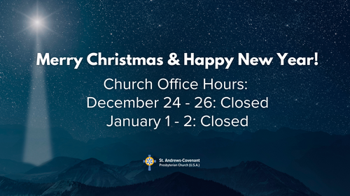 The office will be closed for the Christmas holiday on Wednesday, December 24, through Friday, December 26. The office will be closed for the New Year holiday on Thursday, January 1, and Friday, January 2.