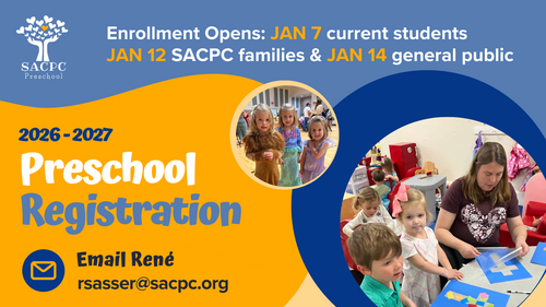 SACPC Preschool's 2026-2027 registration will open for currently enrolled families on January 7. Priority registration for SACPC families begins January 12, with open enrollment beginning on January 14. Email René Sasser for a registration link or more information.