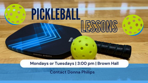 Learn to play pickleball. Lessons available on Monday or Tuesday at 3:00 in Brown Hall for men and women. Contact Donna Philips at 404 226-5976 for more information.