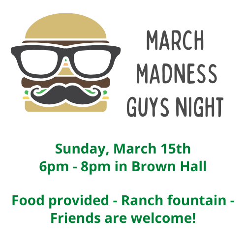 Middle and high school guys are invited to Brown Hall to fellowship, games and the March Madness selection show on the big screen. Friends are welcome and the ranch fountain will be flowing!