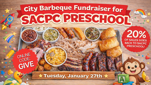 We are excited to announce our next event. Please mark your calendars for Tuesday, January 27, and join us at City Barbeque. All day, City Barbeque will donate 20% of sales to the preschool when you show them a copy of this flyer. Or, use the code GIVE when dining online or on the app. Please make sure to enter the code before checking out.