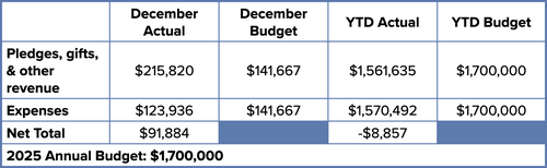 The Finance Committee is pleased to inform the Congregation that as of December 31, 2025 SACPC has received $1,423,988 of the total pledge amount of $3,223,402. These funds are being used to finance the Sanctuary Renovation Project and the HVAC project.