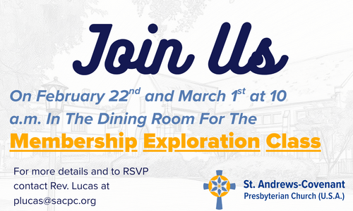 Are you interested in learning about becoming a member of SACPC? Then join us for the Membership Exploration class on Sunday, February 22 at 10:00 am in the Dining Room. This class will provide a general overview of St. Andrews-Covenant and our ministries, as well as what it means to be part of the Presbyterian Church (U.S.A.).