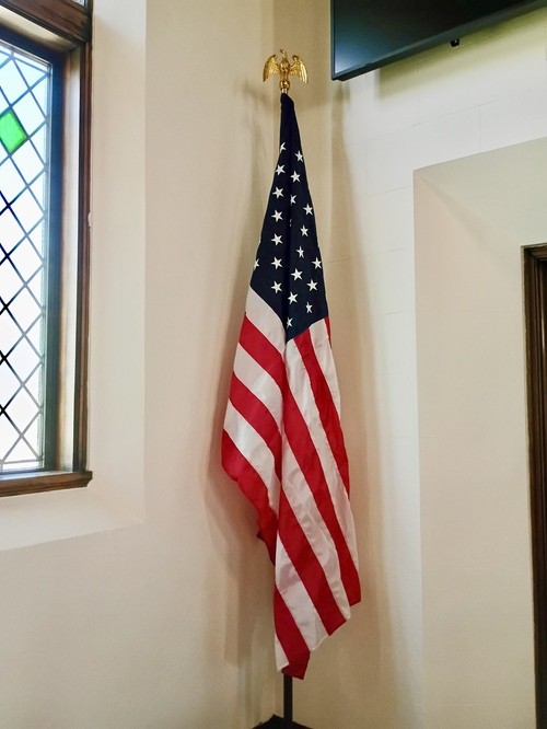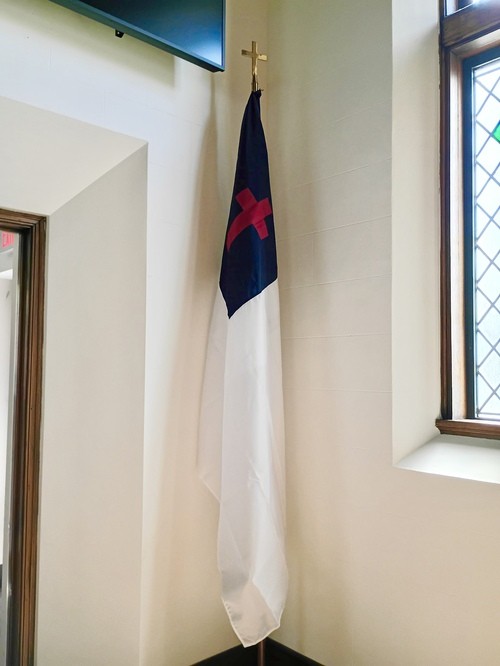 In celebration of the new Sanctuary dedication, brand new American and Christian flags are in place now, donated by a congregation member.