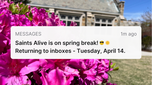 Our weekly e-newsletter, Saints Alive, will take a break next week and return to inboxes on Tuesday, April 14!