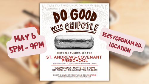 Grab some friends and head to Chipotle on Wednesday, May 6 from 5-9. A percentage of sales from our diners that night will be donated to the preschool. If you order online please use code: KG72RK6. Contact René Sasser for more information.