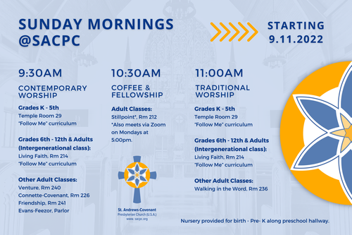 Starting Sunday, September 11th we will offer two worship opportunities--a 9:30AM Contemporary service in the Sanctuary and an 11:00AM Traditional service, also in the Sanctuary. At this time, the 9:30AM Contemporary service is being held in the Sanctuary to provide a livestream option and allow Brown Hall to be used fully as an activity facility.