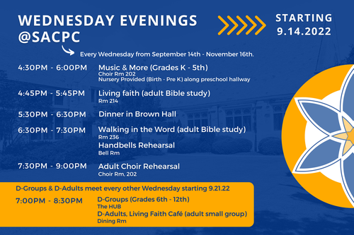Starting Wednesday, September 14th come enjoy dinner with your church family and stay for our music and Christian education opportunities. There's something for everyone!