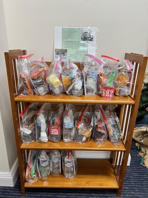 We distribute mercy pouches every year to the unsheltered in our community. These pouches provide snack nutrition and vital information on where to find resources in the Wilmington area regarding shelters, food banks and kitchens, other services. Last year, we distributed approximately 1,200 pouches. Thank you!!!